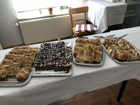 Jeden 1. Sonntag im Monat von Februar bis November laden wir zu Kaffee und selbstgebackenen Kuchen und Torten ein. Das Backteam backt am Wochenende nach traditionellen Rezepten. Es gibt regelmäßig Butterkuchen, Hamburger oder Wickelkuchen, aber auch Torten verschiedenster Art. Änderungen vorbehalten.